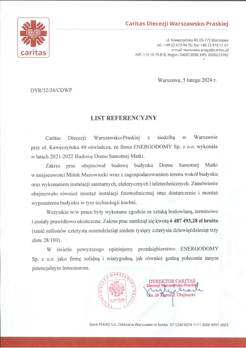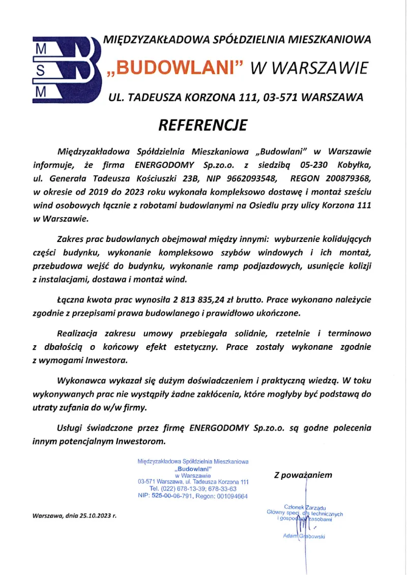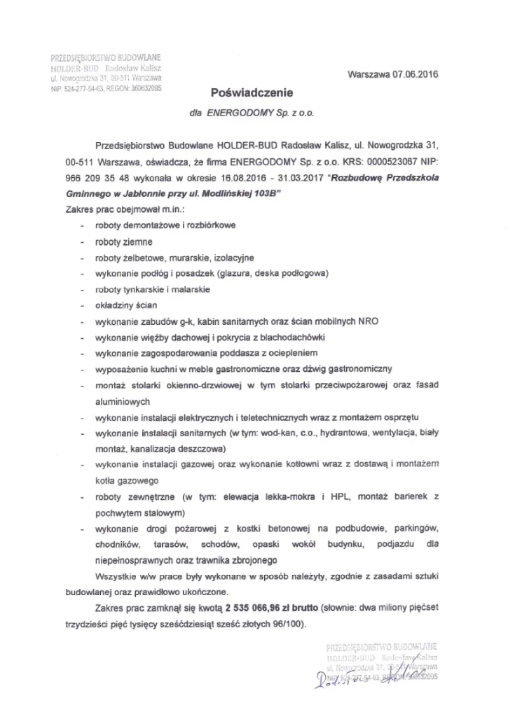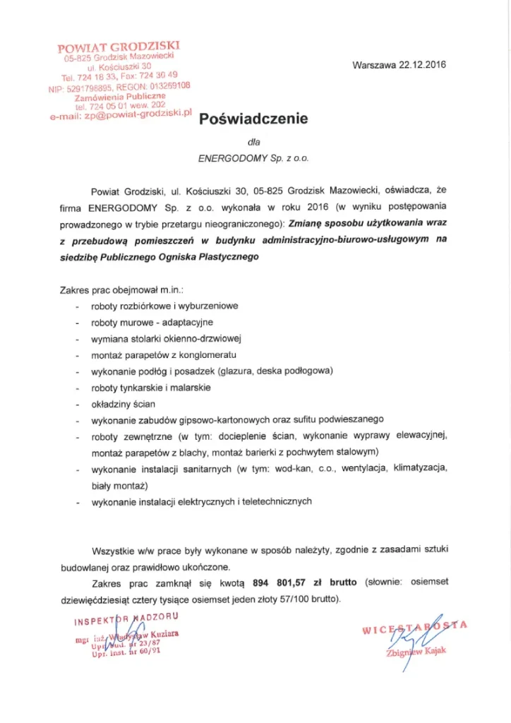 • usługę sporządzenia dokumentacji powykonawczych niezbędnych do odbioru budynku przez odpowiednie służby